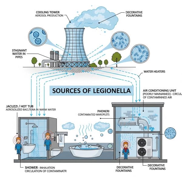 - slabo vzdrževani vodovodni sistemi v stavbah (hoteli, bolnišnice, športni objekti)