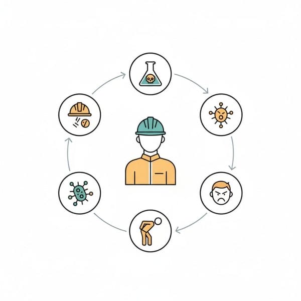 - Identifikacija nevarnosti – fizične (padci, udarci), kemične (izpostavljenost snovem), biološke (mikroorganizmi), ergonomske (prisilne drže) in psihosocialne (stres, mobing).